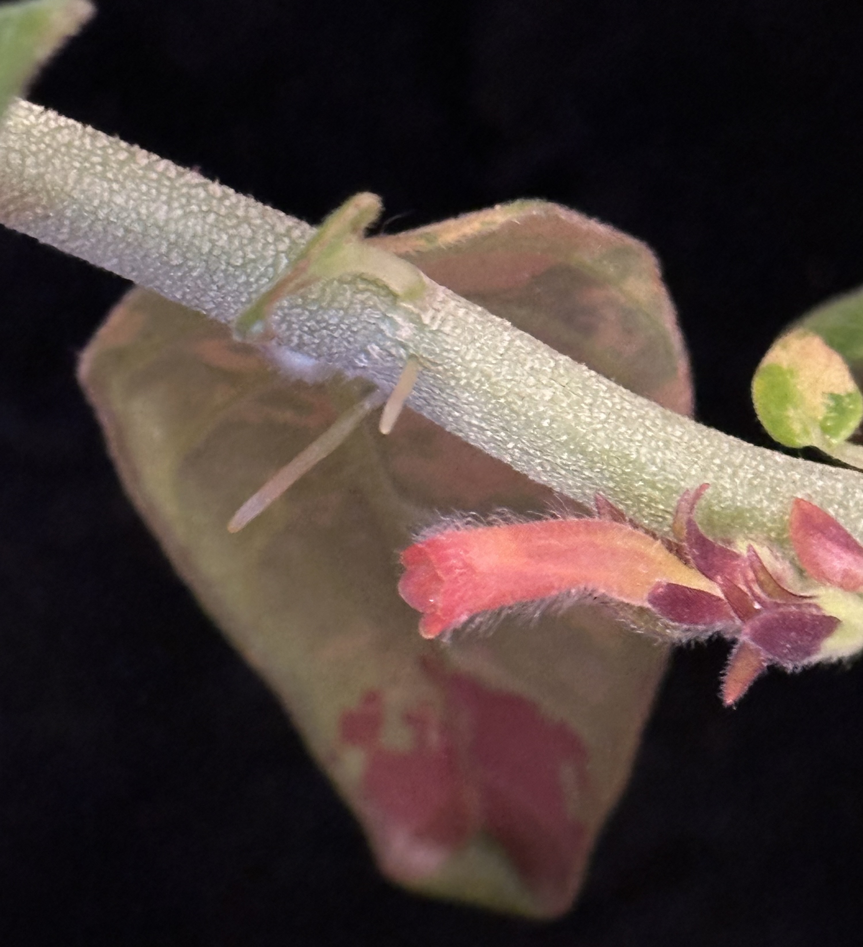 I nice pendant leaves Columnea. The leaves have very short hairs and are slightly purple in color. Not sure what the difference is between this cultivar and the species.